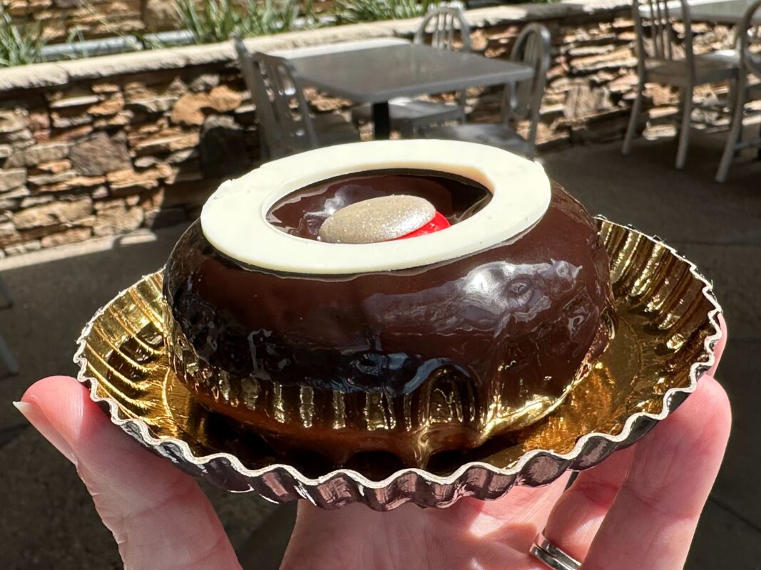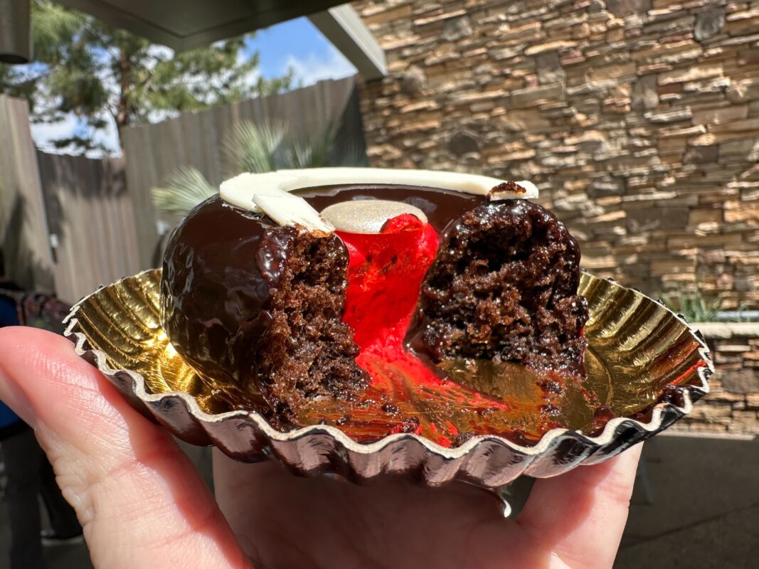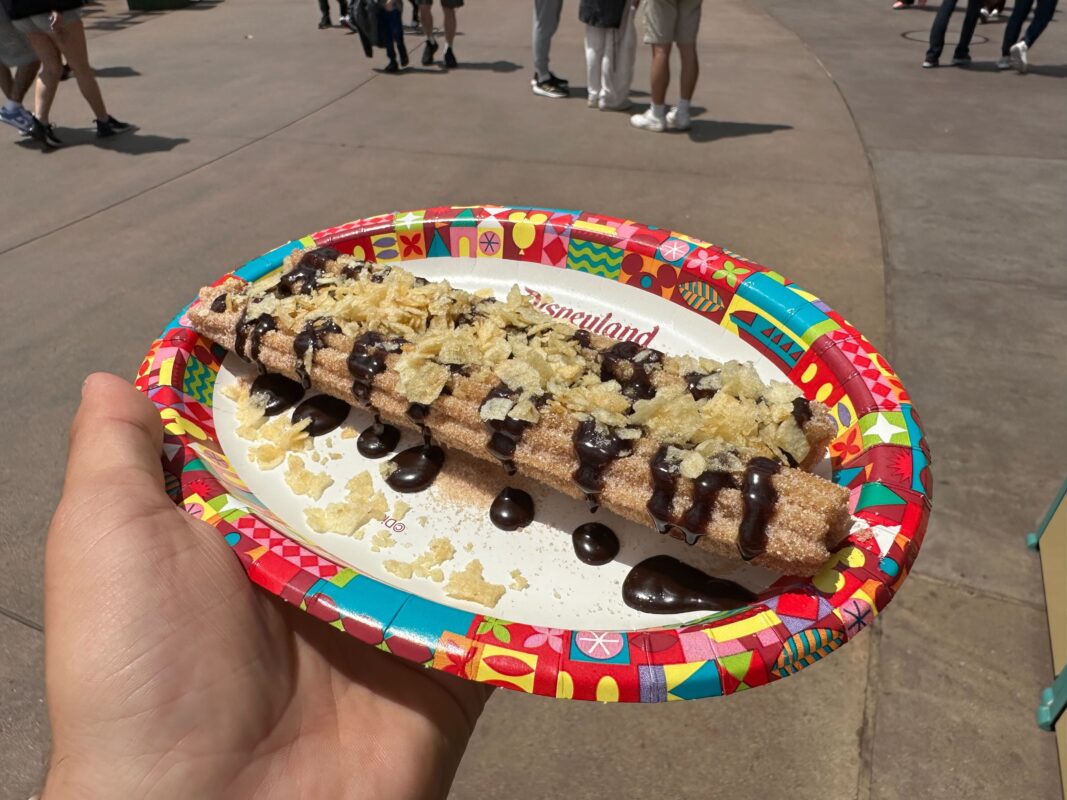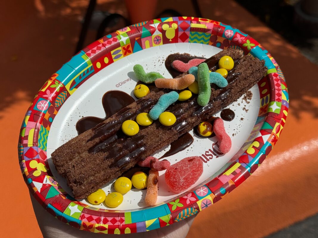 We’re unsure why they chose to top it with only yellow M&Ms. We don’t think this is good and find it to be a weird combination overall. It tastes like coffee grounds on a churro, and the gummy worms don’t work at all here. For a resort known for its churros, this is super disappointing. The “oil” sauce is supposed to be chocolate, but it looks and tastes like oil.