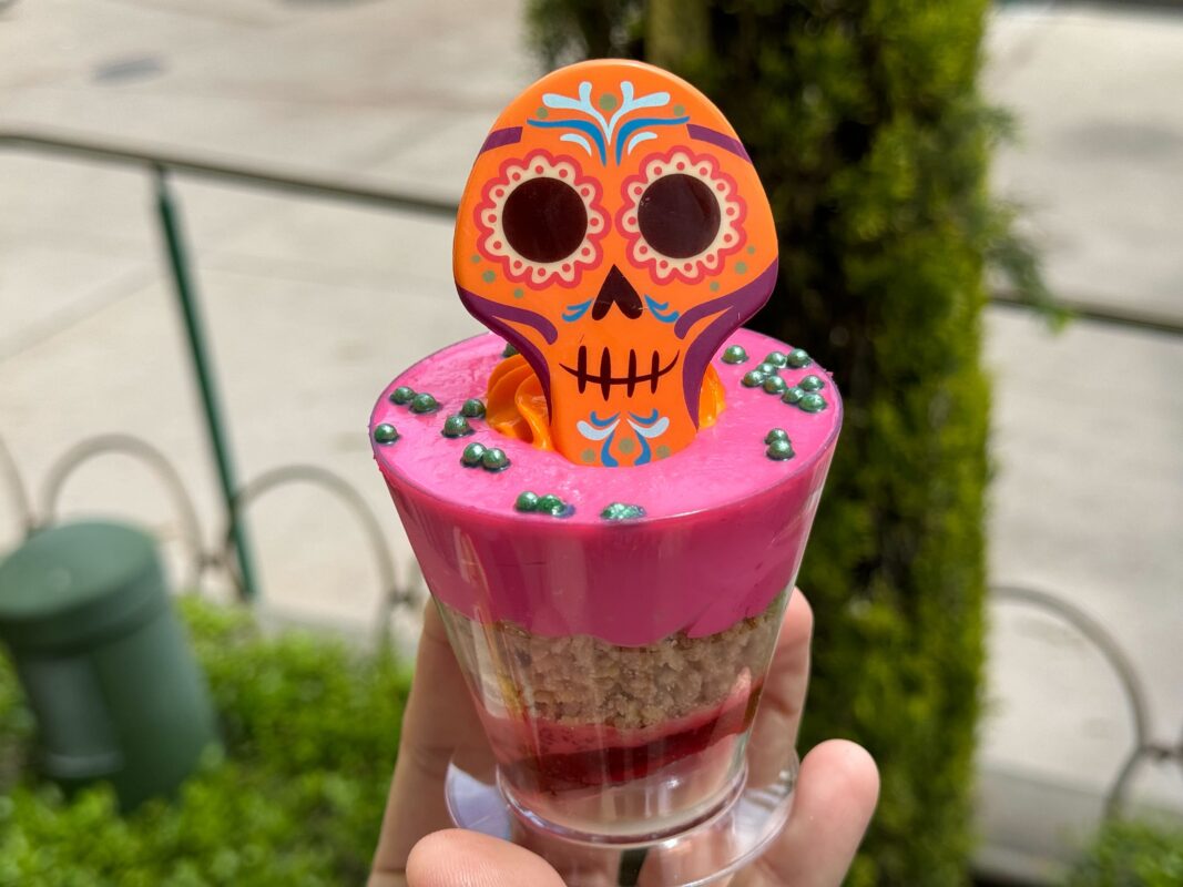 topped with Churro Crunch and Pink Cinnamon Mousse, finished with Green Pearls, Orange Mousse and Chocolate Skull Decoration