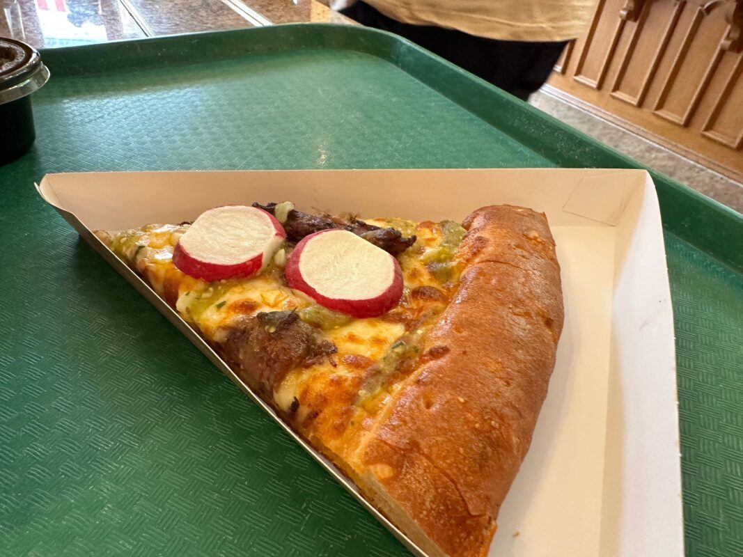 This is the saltiest slice of pizza we’ve ever had. To add to the insult, the cheese is very low quality. The beef is phenomenal, moist, and tender with a smoky flavor. The problem is that the pizza is terrible. The crust and cheese are both too thick and it tastes like we dumped a salt shaker into our mouths.