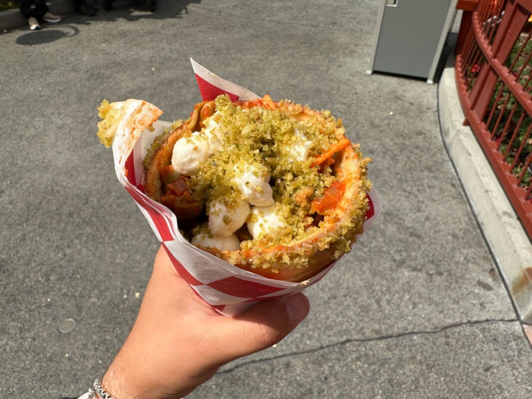The smell of this cone reminds us of a Sbarro. The pasta isn’t horrendous, but we don’t recommend it. However, it could be worse. It’s edible but very low quality. It’s a shame because the regular cone offered here is fantastic. The cone itself is somewhat chemical in taste. This dish deserves a single point because it’s edible, but we insist you avoid this.