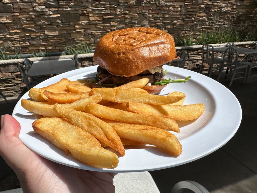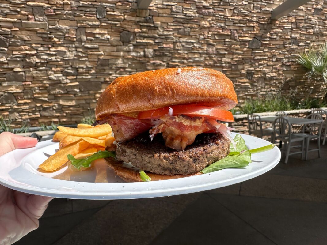 This is phenomenal. You absolutely taste the mushroom coming through with the beef in the patty. There’s so much going on, but it’s a perfect mix. It’s pretty complex for a theme park hamburger. The blueberry compote has a balsamic flavor, and the bun is soft and buttery. Flo’s steak fries are always great, too.
