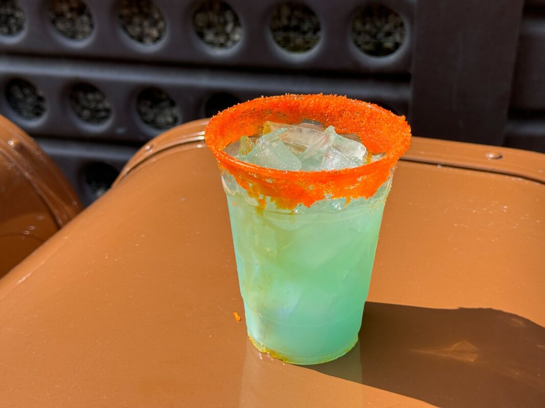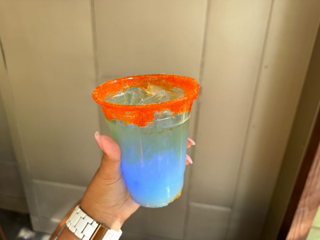 Blue Raspberry Lemonade in an Orange Sugar-rimmed Cup with a Glow Cube