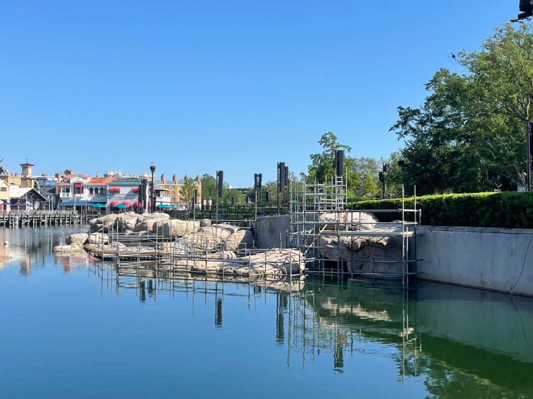 On the side of the lagoon where guests will watch the show, scaffolding has started to go up around the rock facade in the water.