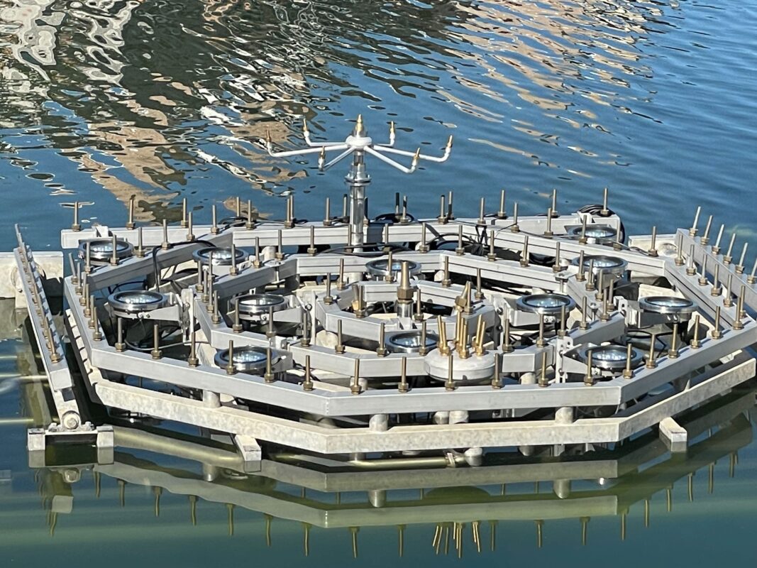 The water level has started to rise and is almost at a normal level. Now, only the tops of the fountains are visible and most of the fountain platform is underwater.