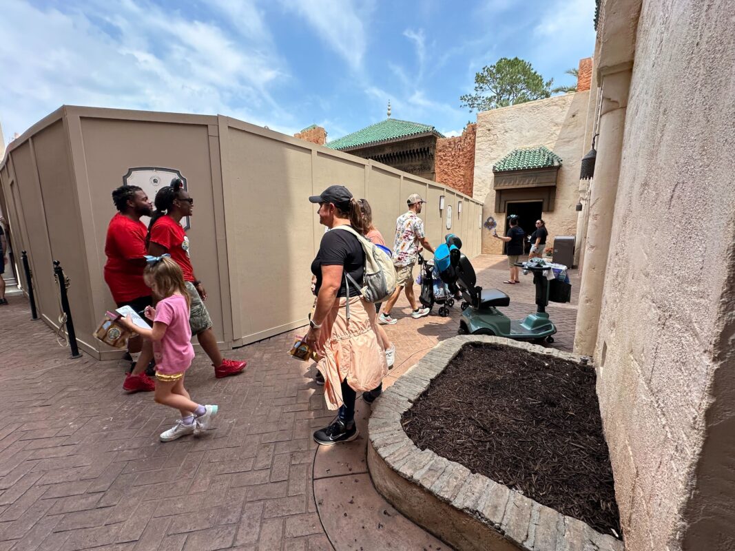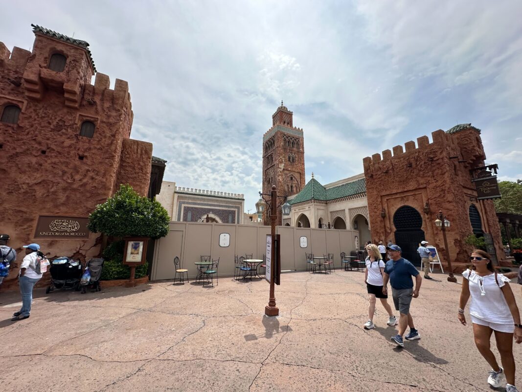 A group of people walk past a construction barrier at the Morocco Pavilion in Epcot. The pavilion features traditional Moroccan architecture with a tall tower in the background under a cloudy sky.