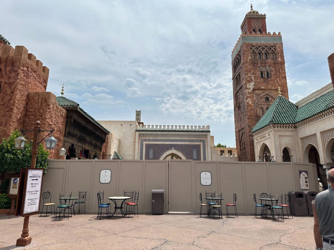 Construction walls now take up most of the entrance courtyard of the Morcoco Pavilion in EPCOT. This latest round of construction work began in March.