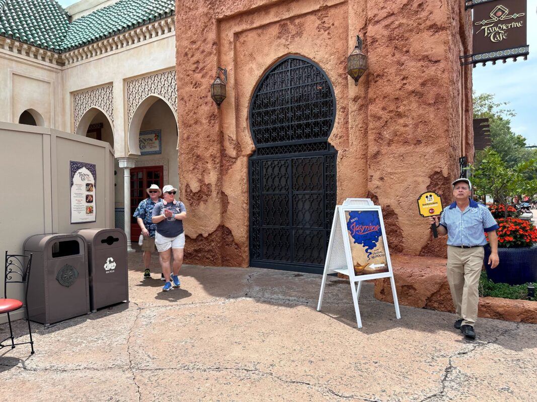 When we visited on Friday, a Cast Member was stationed at the front of the pavilion with a paddleboard sign advertising the Annual Passholder lounge. The limited-time lounge is in Restaurant Marrakesh at the back of the pavilion. An A-frame sign was also up advertising the Jasmine meet and greet.