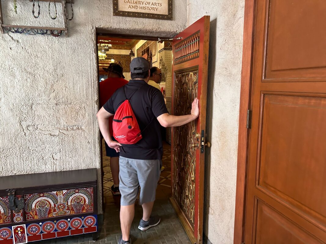 A person wearing a black shirt and gray shorts, with a red backpack, is entering a room through an ornate, partially open door.
