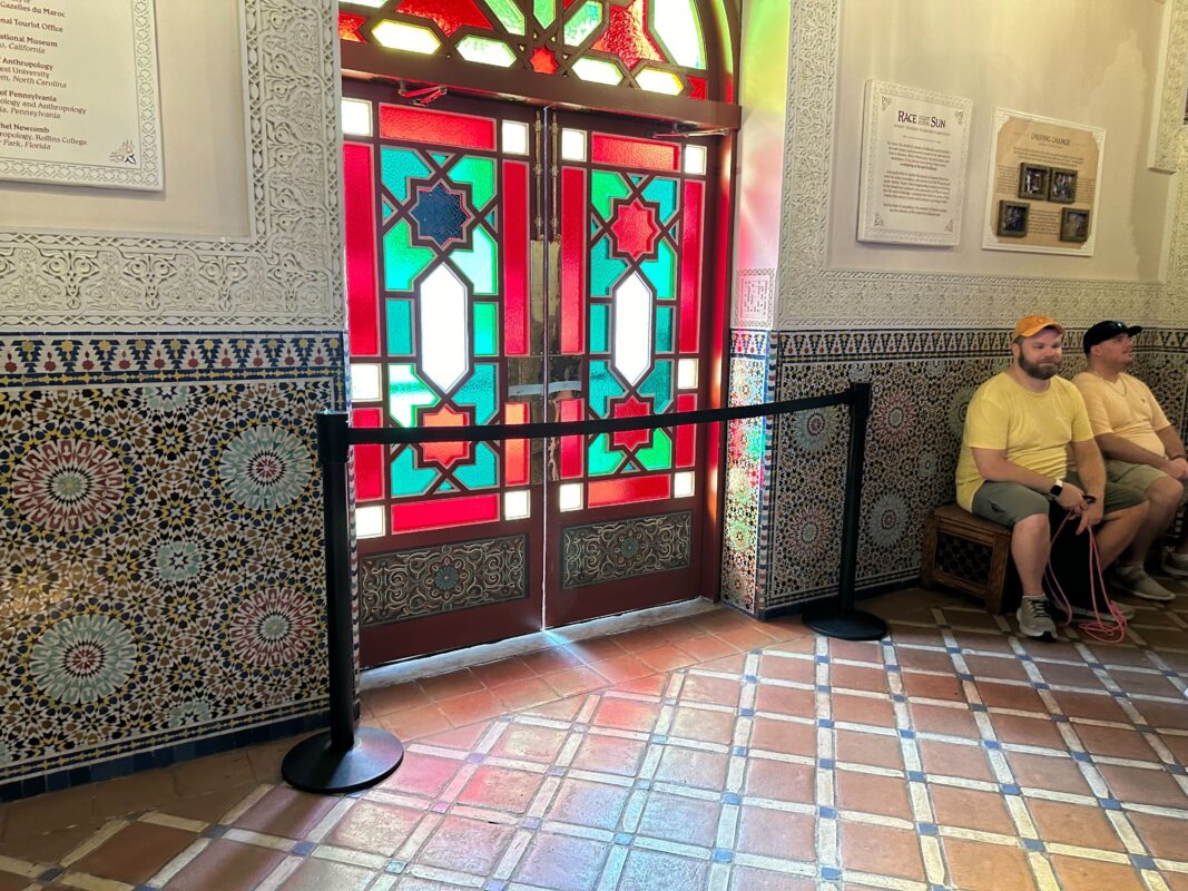 A hallway with intricate tiled walls, colorful stained glass doors, and two benches. Two people are seated on a bench to the right. A black barrier prevents entry through the doors.