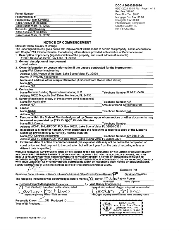 The Notice of Commencement, filed on May 23, 2024, is to install Walt Disney Imagineering trailers in a “backstage” area behind Kali River Rapids and Maharaja Jungle Trek at Disney’s Animal Kingdom. The trailers will likely serve as a base for Imagineers as they work on transforming Dinoland U.S.A into a new Tropical Americas land, which is set to feature attractions themed to “Encanto” and “Indiana Jones.”