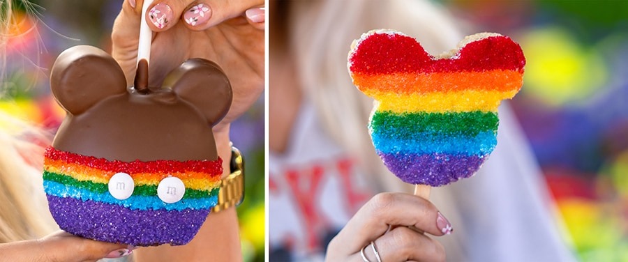Two hands holding rainbow-colored Mickey Mouse-shaped treats, one chocolate-covered apple and one sugar-coated cookie on a stick, celebrate Pride Month 2024 at Disney Parks, with a colorful blurred background.