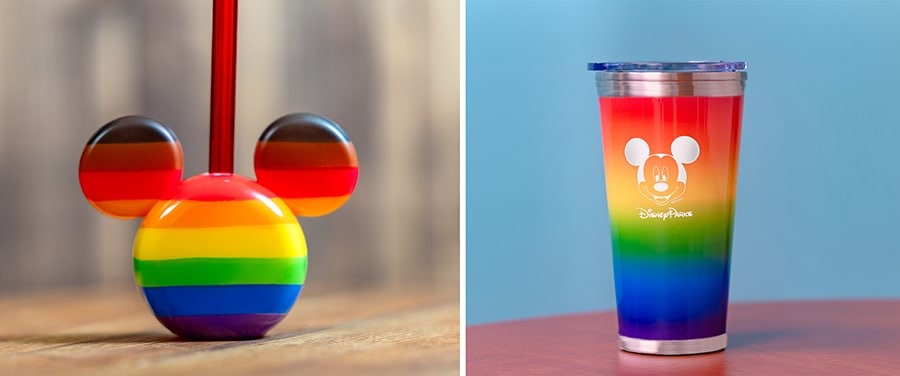 Left: A clear tumbler with a blue lid featuring colorful silhouettes of a running figure. Right: A vibrant cube with rainbow layers, topped with a red figure, and a yellow flexible tube attached—perfect for celebrating Pride Month 2024 at Disney Parks.