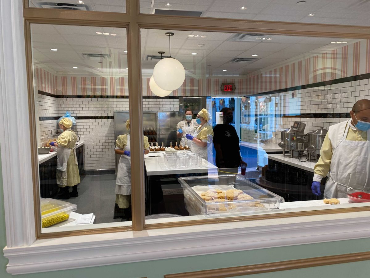 When in the kitchen, Confectionery Cast Members wear full white aprons. The old costumes were mostly yellow with white accents, as seen below.