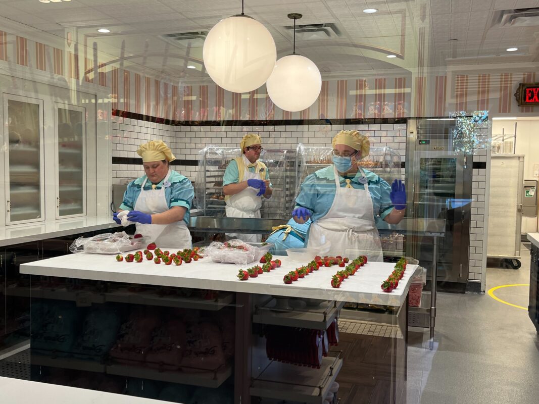 The new costumes are mostly blue and yellow. One combination is a pinstriped blue top, a yellow vest, a yellow bowtie, and gray pants. The other combo is a blue dress with a yellow apron. All Confectionery Cast Members wear a yellow baker’s hat.