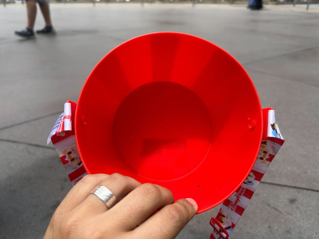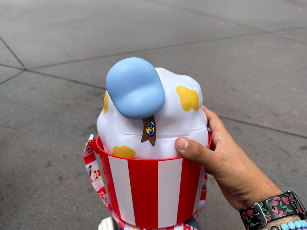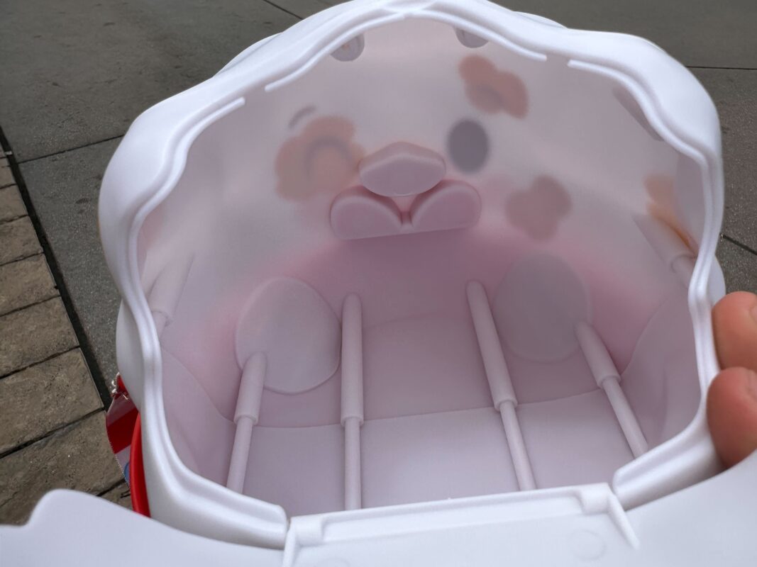 The bucket has two compartments: inside Donald and inside the red and white striped base. It’s made to resemble a Munchlings plush. The plush itself hasn’t arrived at Disneyland Resort yet but it can be found at Walt Disney World or online at the Disney Store.
