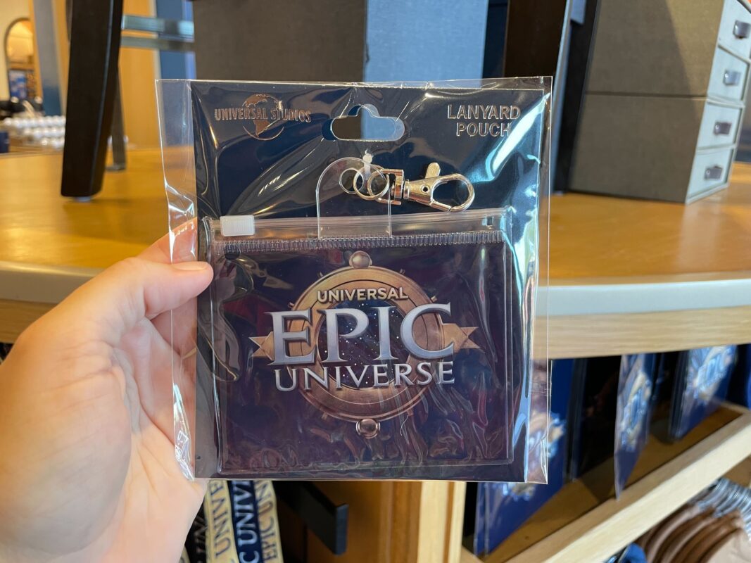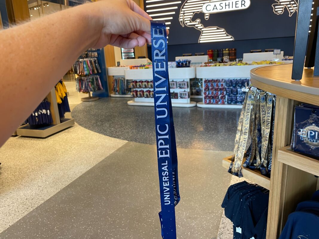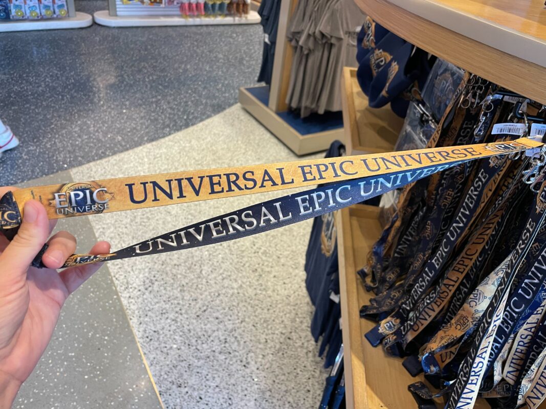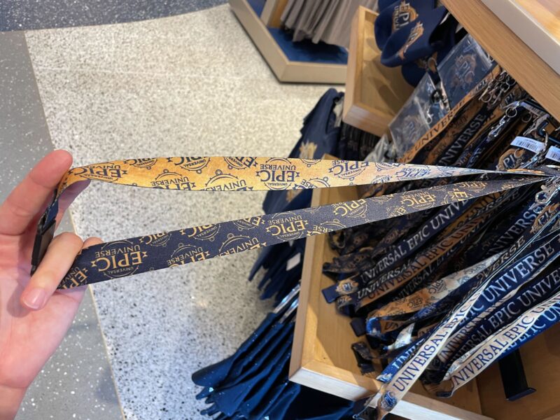 This reversible lanyard is blue and gold, with one side depicting the Epic Universe icon and the park’s name in all caps.