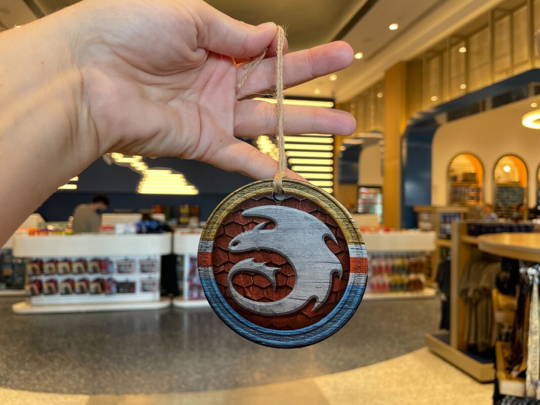 This ornament is stylized to look like the wood-made decorations guests will find in the land, with a dragon crest set against a scale-like pattern with shades of yellow, white, orange, and blue.