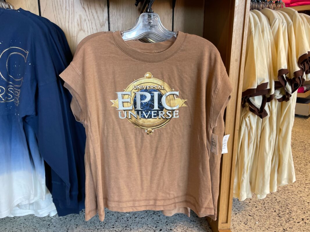 This camel brown T-shirt features a drop sleeve, with the Epic Universe icon on the front.