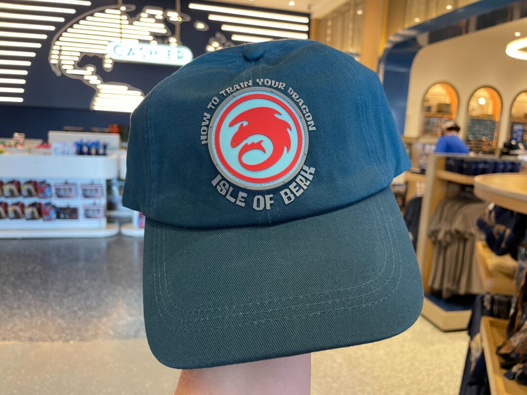 A petrol blue ball cap featuring the How to Train Your Dragon – Isle of Berk icon is also available. The land’s name is in silver around the icon, which is shown in a minimalistic take of light blue and orange-red.