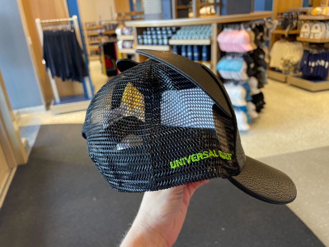 The back of the hat is a black mesh, and has “Universal Studios” embroidered in bright green.
