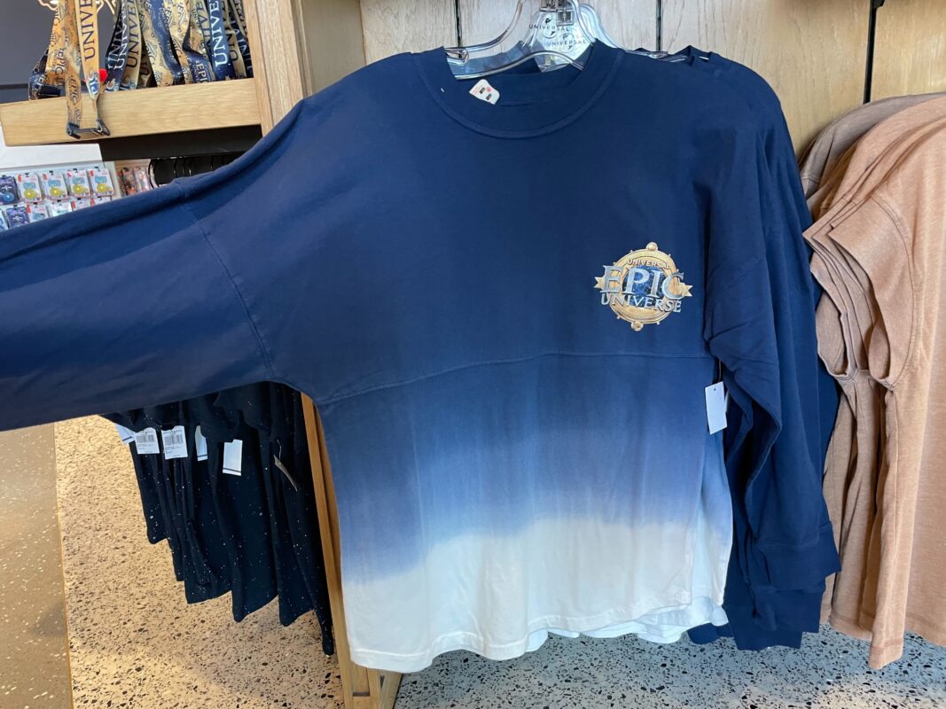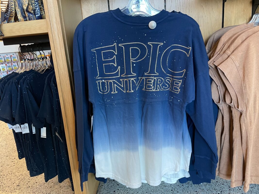This new jersey-style long-sleeve shirt sports a blue-to-white ombre with stars across the back shoulders. The Epic Universe wordmark is in a metallic gold outline.