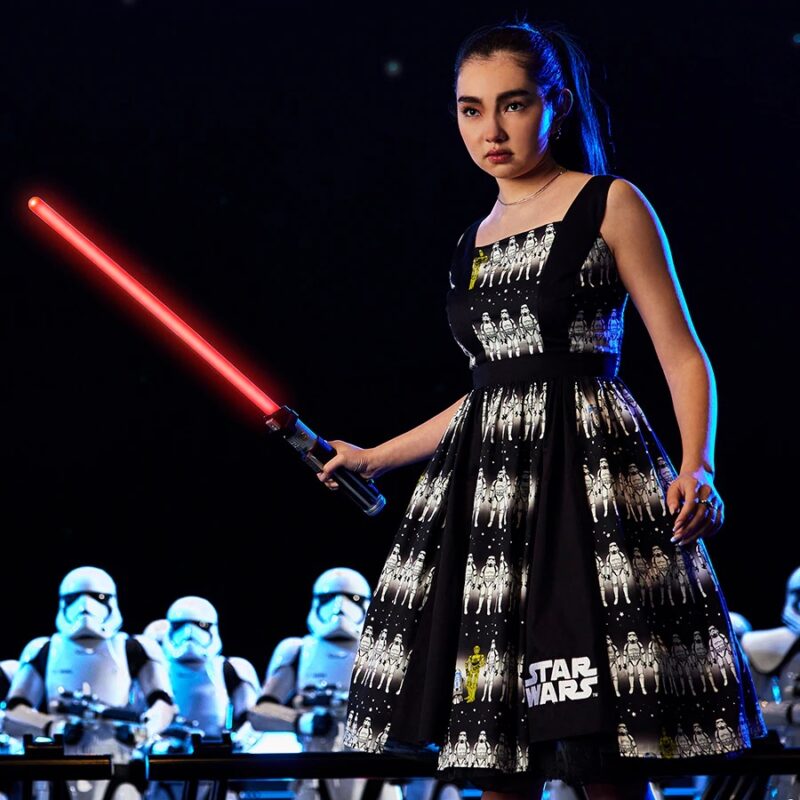 Young woman in a star wars-themed dress holding a red lightsaber, with stormtroopers in the background on a stage.