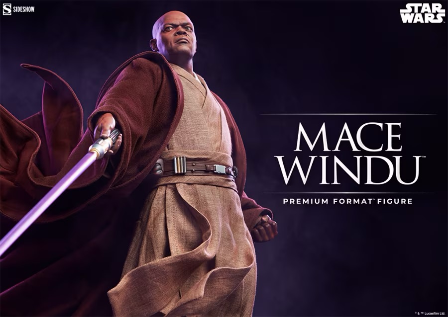 Promotional image of a mace windu premium format figure from star wars, featuring the character in a dynamic pose with a lightsaber.