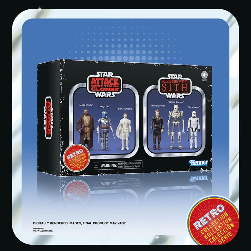 Available for preorder beginning May 4, Hasbro will release new Black Series, Retro Collection, and Vintage Collection figures. This includes the above Retro Collection “Star Wars Episode II” and “Episode III” Multipack figures.