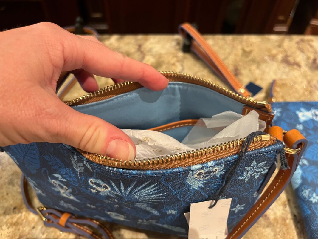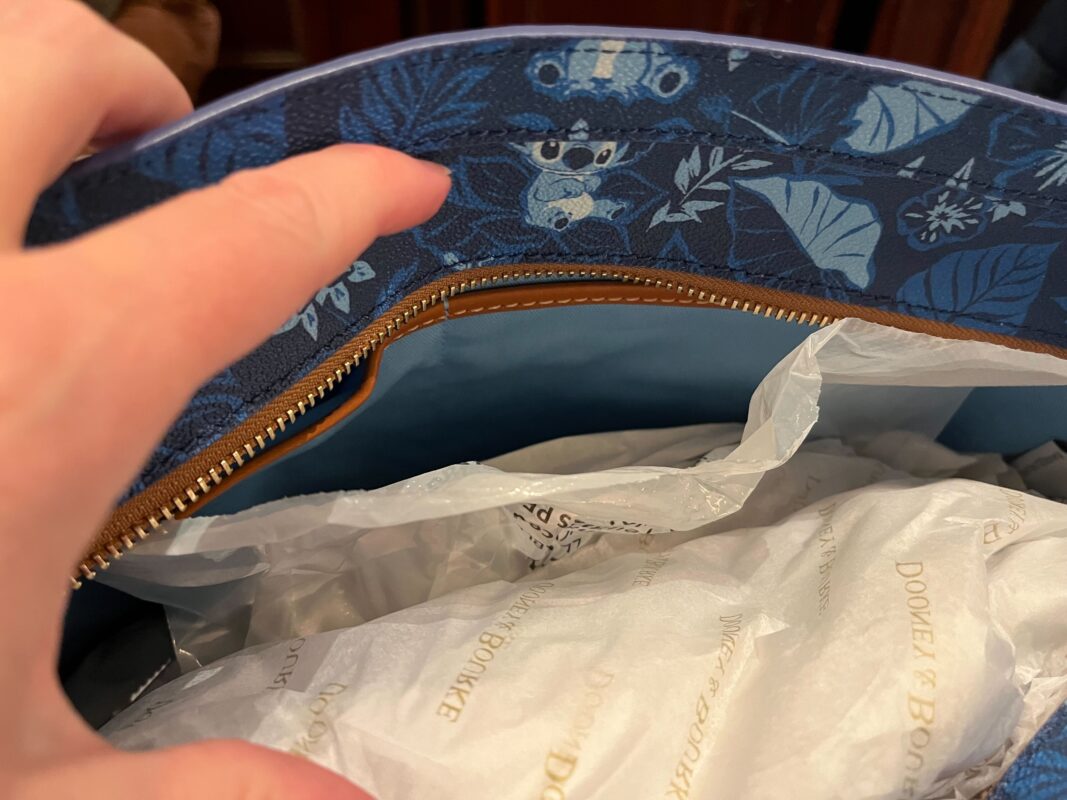 The lining of the bag is also light blue, with a slip pocket inside. It is also available for purchase online from the Disney Store.