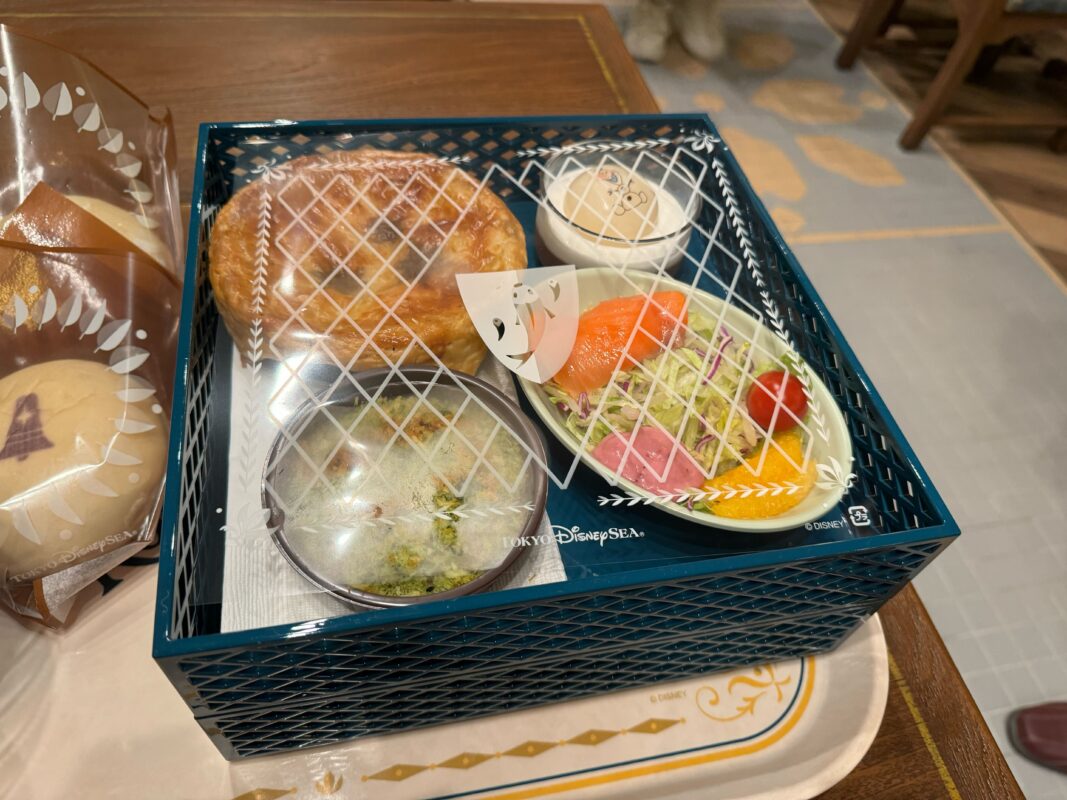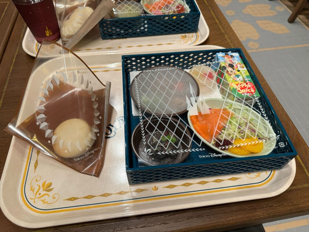 The meals come on trays with golden filigree. All the food except the bread is in a blue square basket, under themed transparent plastic covers. The baskets are stackable — perfect if you’re ordering every meal.