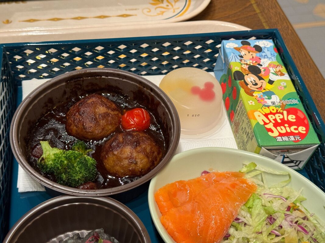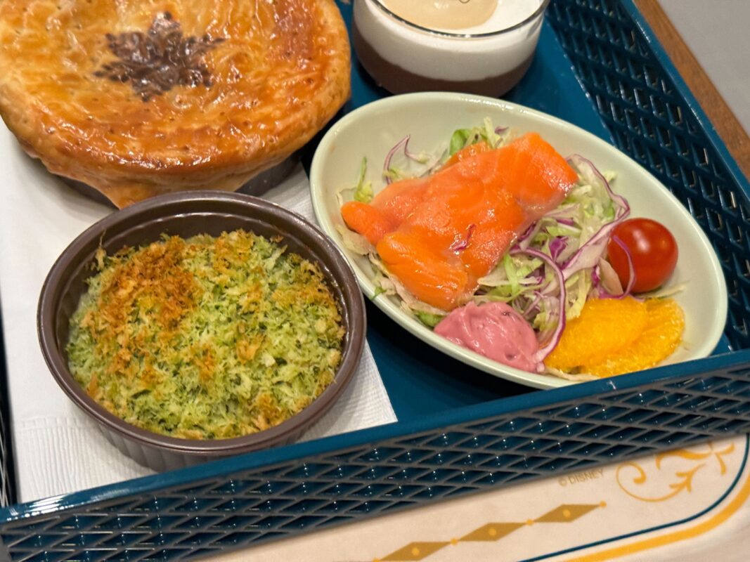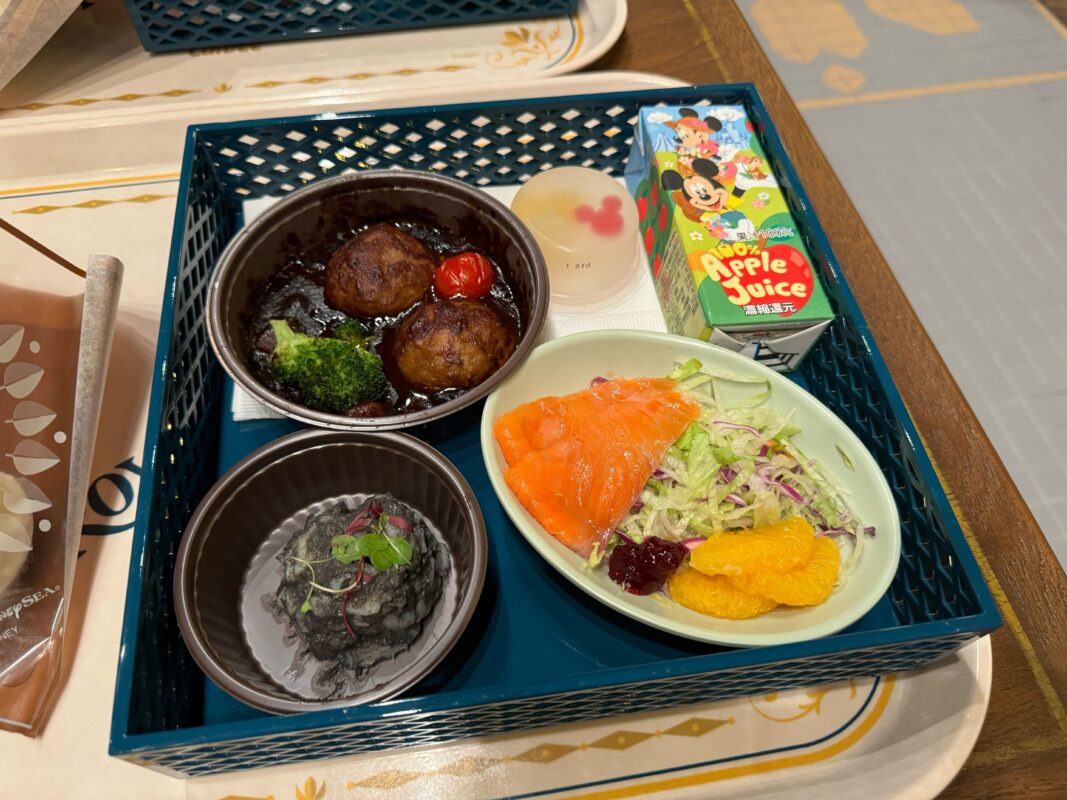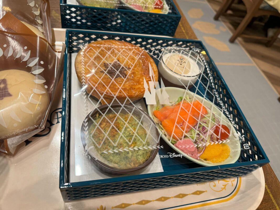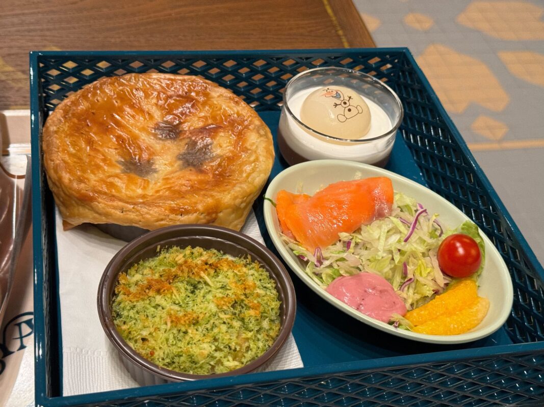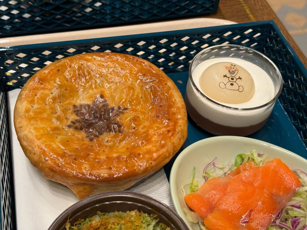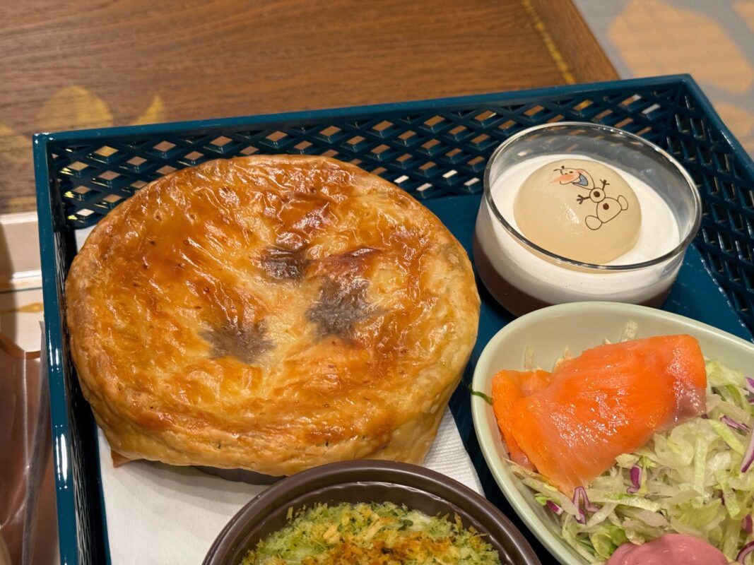 Calbee, Inc. sponsors the Royal Banquet of Arendelle. There are two adult meals called “Royal Sets”: seafood and beef. Both meals include potato gratin; bread, smoked salmon, trout, and orange salad; Olaf’s Marshmallow Cocoa Mousse; and a choice of soft drink. For an additional ¥390, you can upgrade the soft drink to a draft beer. For ¥340, you can upgrade the drink to wine. We also tried the kids’ meal.