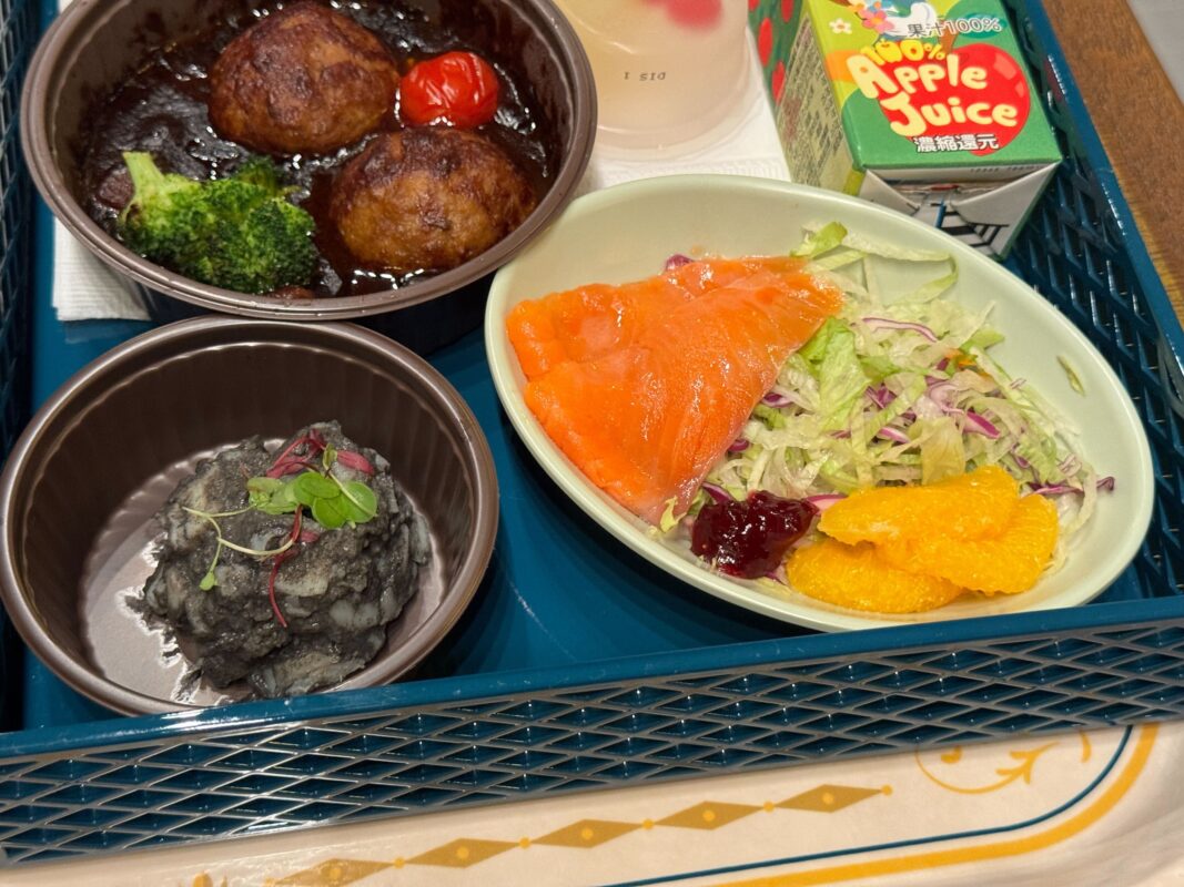 The kids’ royal set includes meatball stew; potato salad; smoked salmon, trout, and orange salad; fruit jelly; rice flour bread; and apple juice.