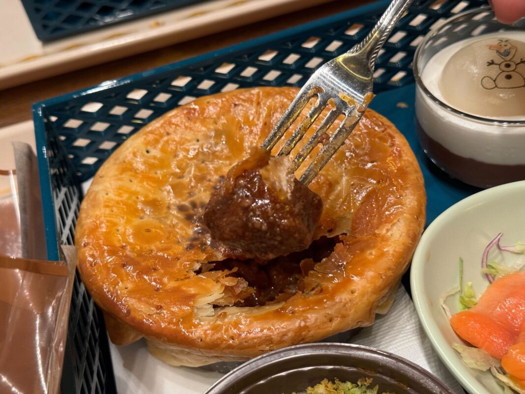 The beef pie is decorated with a snowflake stamp. The crust is buttery and flaky.