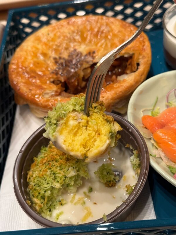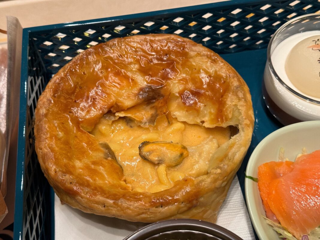 There are big clumps of redfish in this pie. It’s a little too fishy but it’s not bad. The fish is flaky. We also found oysters. The sauce is a creamy bisque. Again, there’s well-cooked cauliflower and pasta. We prefer the beef but this isn’t bad.