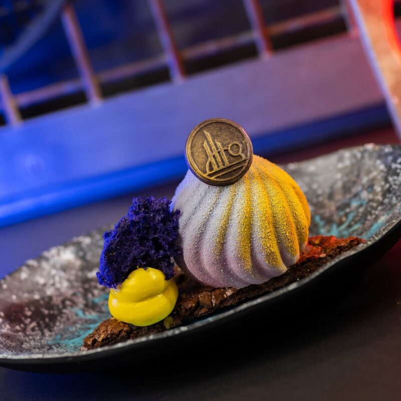 Joining the menu on June 3, the first new item is a dessert: Black Spire Mousse. This treat is white chocolate jogan fruit mousse set atop a brownie pistachio brittle, served with blue milk sauce, pineapple cream, and a hibiscus sponge, all topped with a chocolate Black Spire coin.