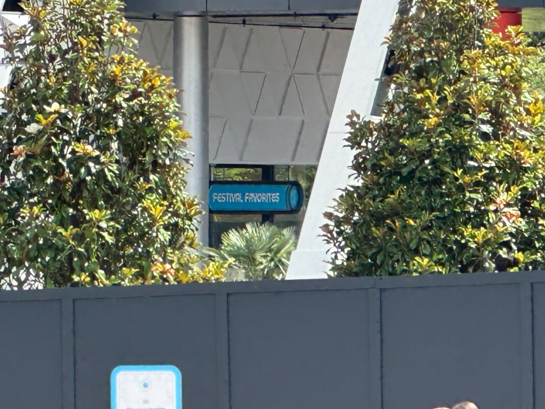 Festival Favorites is the name of an old EPCOT festival booth. It would feature favorite dishes from past festivals. The sign indicates this booth will return as part of CommuniCore Hall, maybe as a permanent offering with a rotating menu.