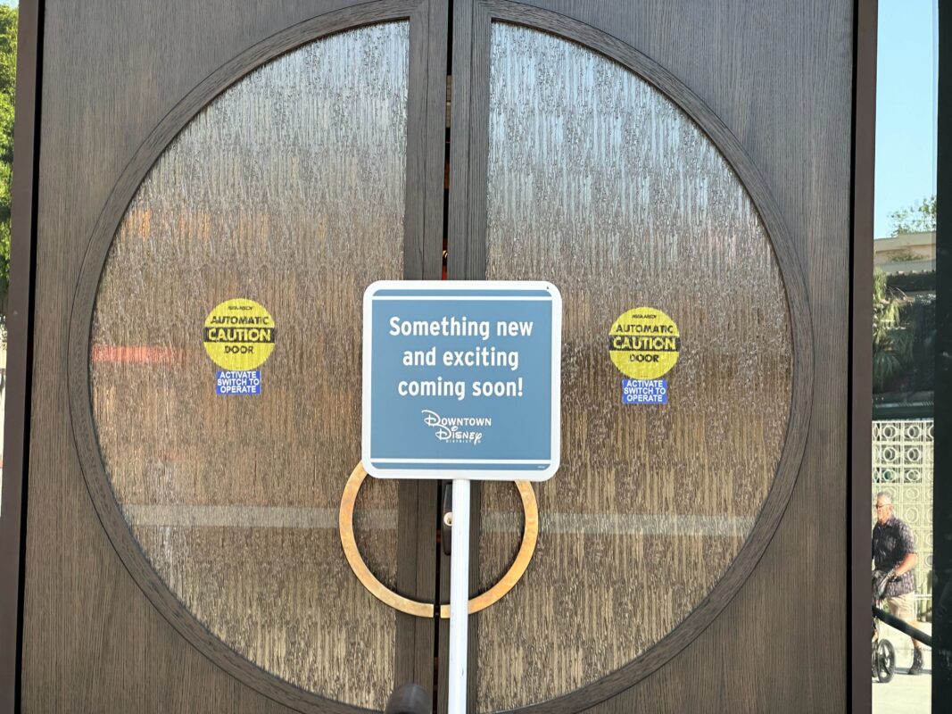 Large double doors with a sign in front reading "Something new and exciting coming soon!" at Downtown Disney. There are "Automatic Caution Door" signs on both doors.