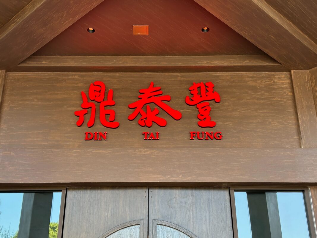The front doors are brown wood with curved bronze handles. “Din Tai Fung” is in red English lettering and Chinese characters above the doors.