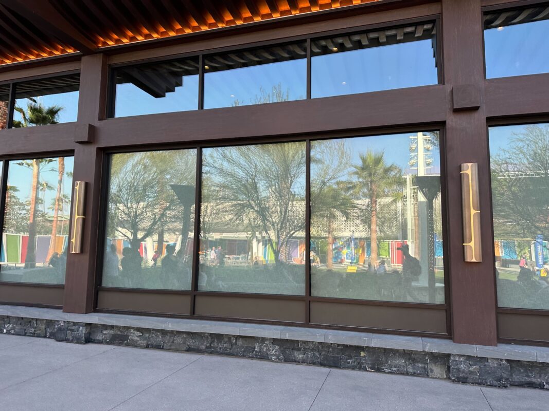 Large windows in a brown wooden frame reflect trees, colorful banners, and an outdoor area on a sunny day. Two gold-colored handles are visible on the sliding door sections.