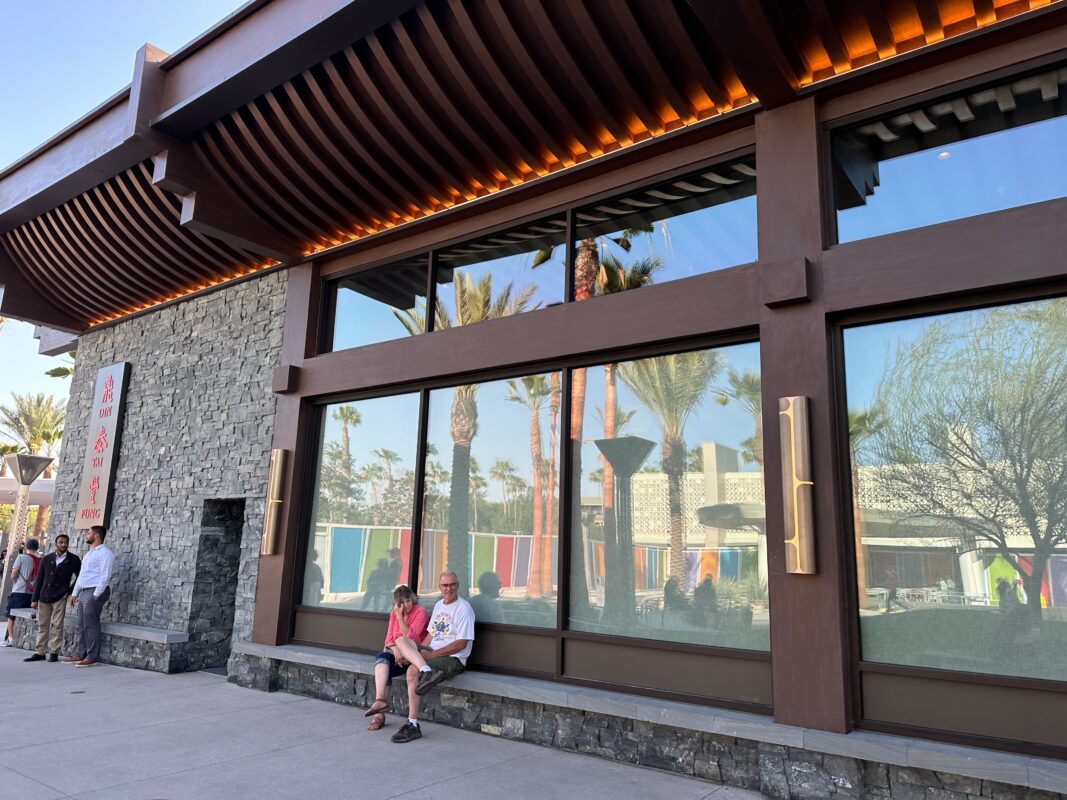 People stand outside a modern building with stone walls and a wooden roof. The building has a red sign with Asian characters on it, and palm trees are in the background. It is sunny and clear.
