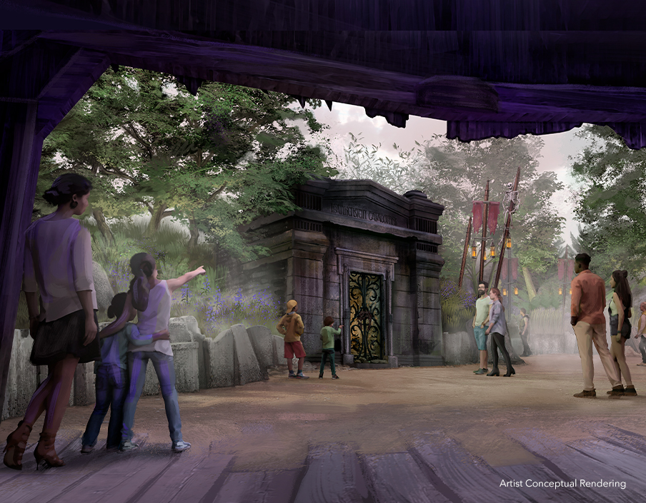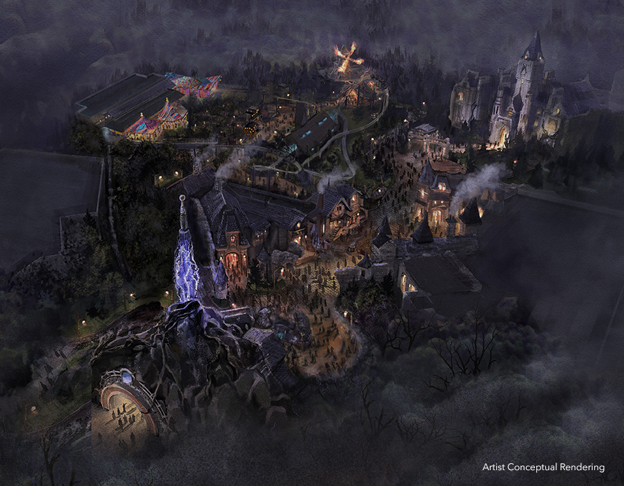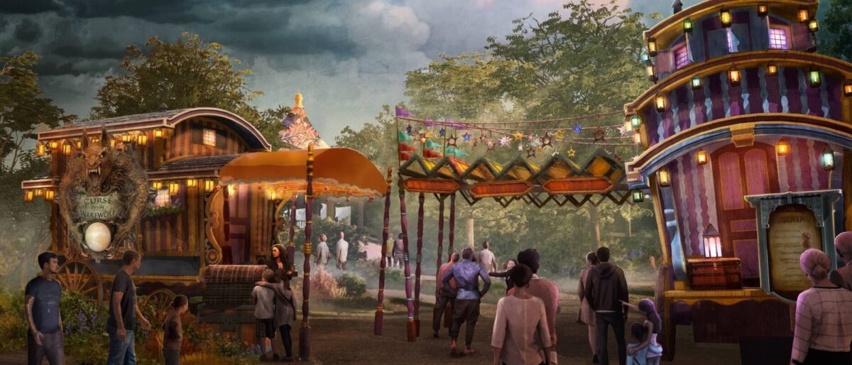 In the woods that border the village lies the other Dark Universe attraction, Curse of the Werewolf. This family coaster will be located in a colorful encampment named The Guild of Mystics, where guild seer and leader Maleva, will warn visitors that they bear the mark of the werewolf.