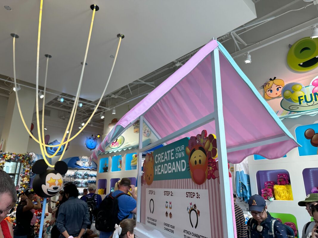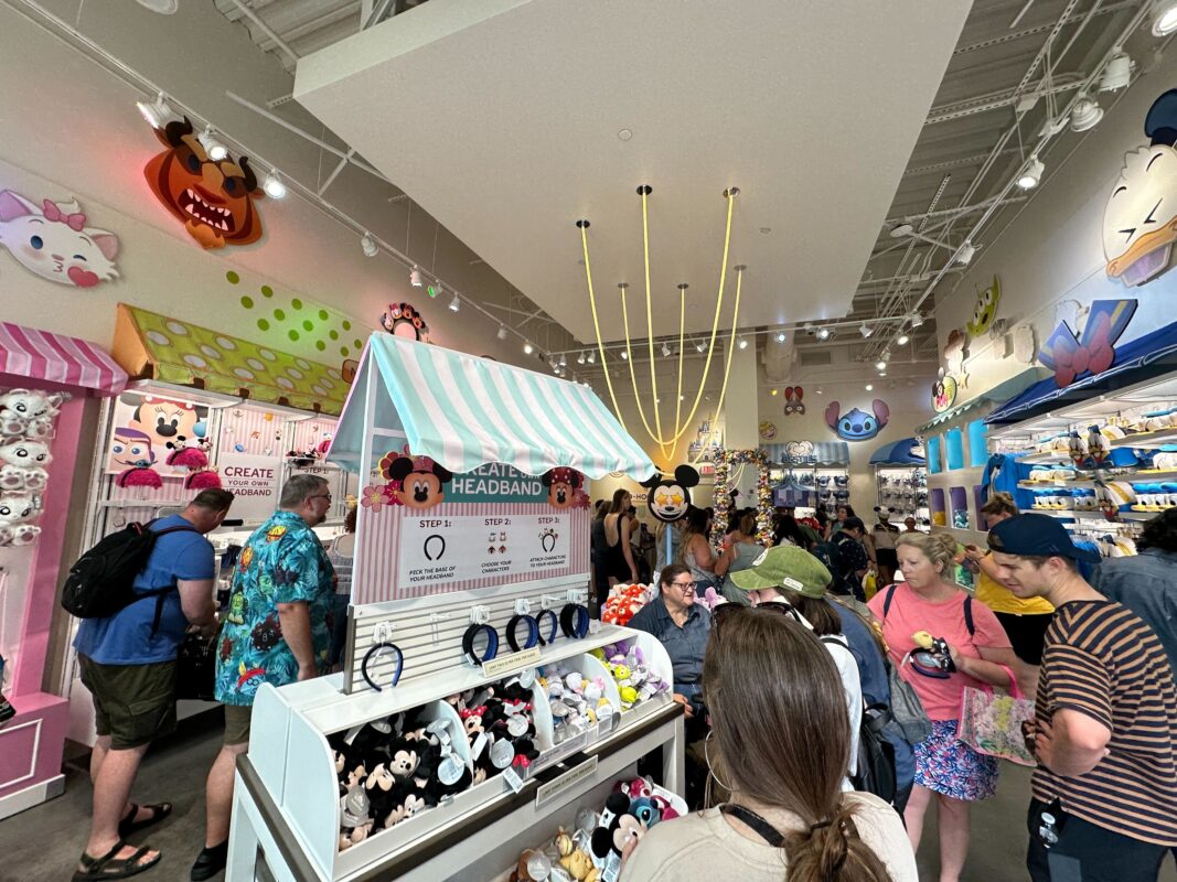 A crowded store with a "Create Your Own Headband" booth featuring a step-by-step guide. A Mickey Mouse decoration hangs nearby, and customers are browsing various colorful items.