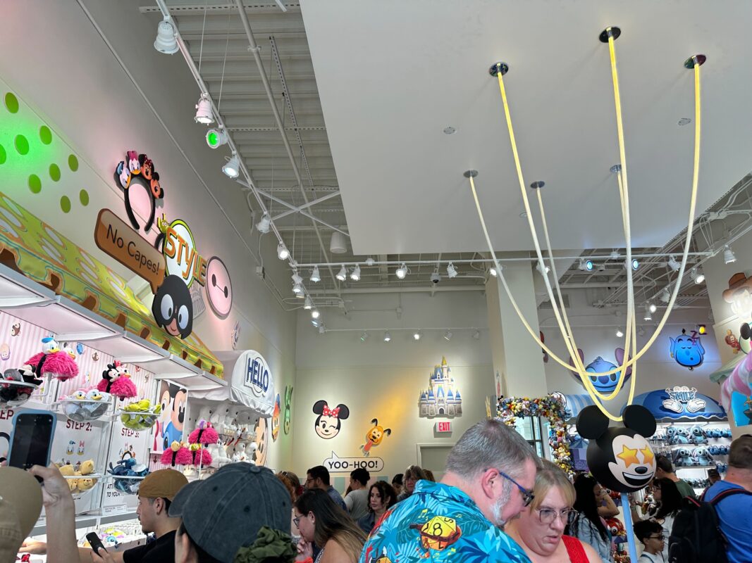 A crowded store filled with various Disney-themed merchandise. People are browsing and shopping, with items like headbands, plush toys, and wall decorations visible.