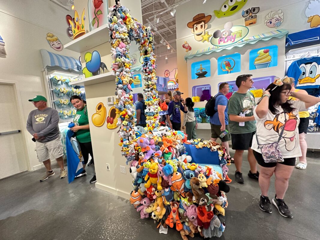 People inside a store filled with colorful plush toys. A column is heavily adorned with various stuffed animals. Shoppers examine items and walk around the vibrant, character-themed interior.