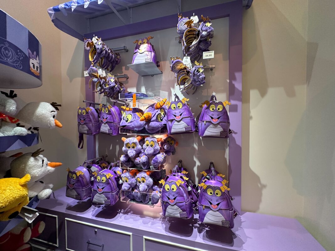 There are still some Loungefly bags available at Disney Ever After. The Figment Loungefly backpack is on a purple display case alongside Figment plush.