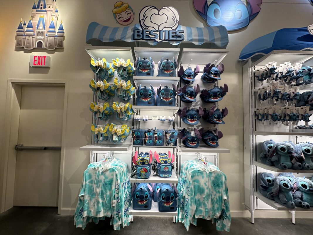 Stitch merchandise is under a sign reading “Besties.”