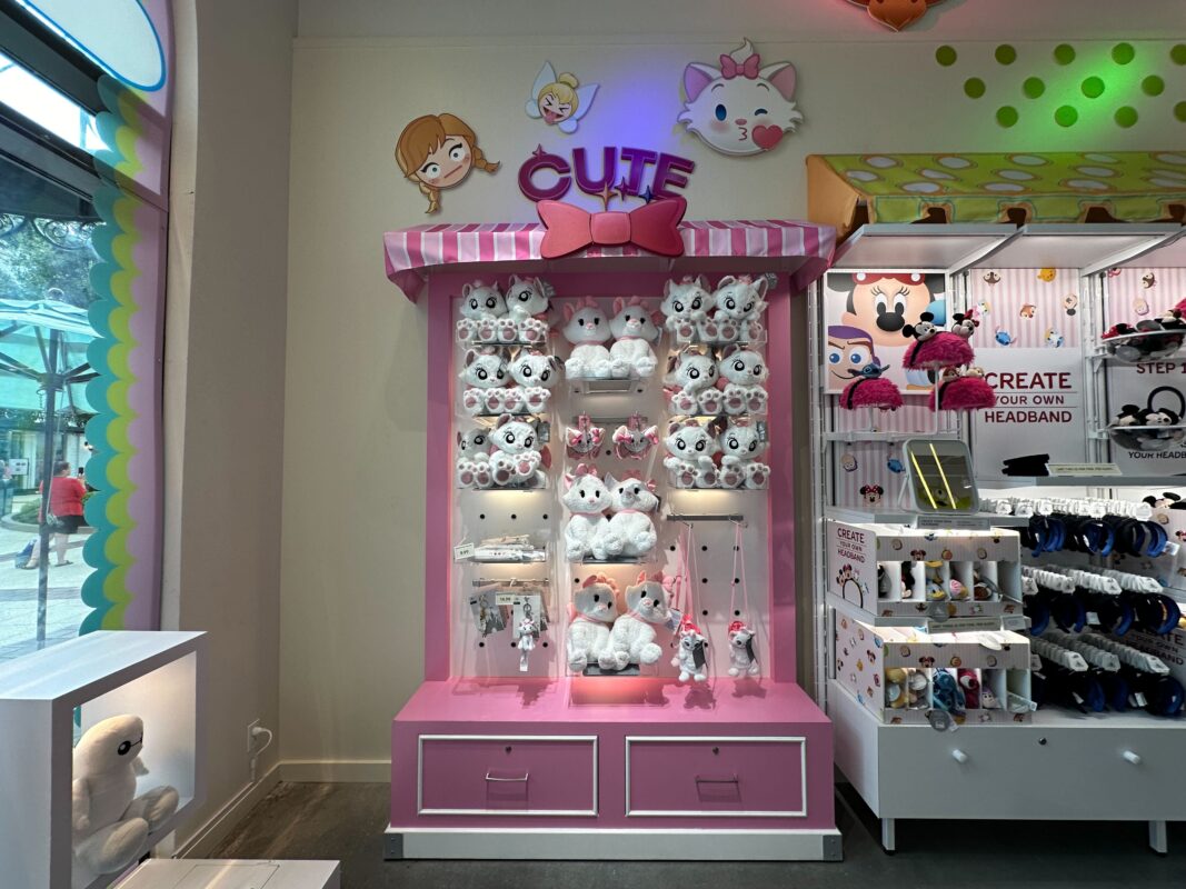 A pink display showcases plush of Marie from “The Aristocats.” There’s a giant pink bow on the striped awning. A wall decoration above reads “Cute.” There are emoji images of Anna, Tinker Bell, and Marie.