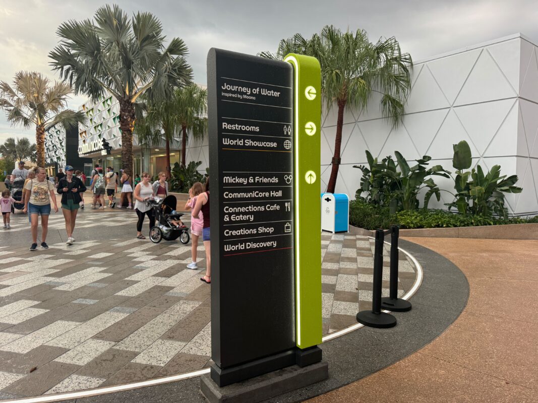 With the design changes and new neighborhoods, old signs were removed and new ones were installed. The new signs have a sleek black design with rounded letters matching the EPCOT logo. The signs are also color-coded to each neighborhood: blue for World Celebration, green for World Nature, red for World Discovery, and yellow for World Showcase. Even signage on Living With the Land was updated.
