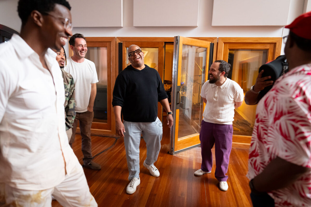 A group of five people standing indoors in a circle, laughing and engaging in conversation. Some wear casual attire, including a camouflage jacket, white shirt, and a black sweater. The group worked together to record the Tiana's Bayou Adventure soundtrack.