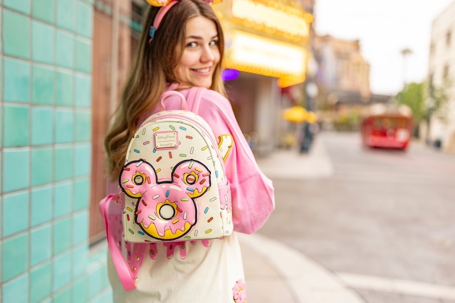 The new Mickey Mouse donut Loungefly mini backpack is cream-colored and covered in colorful sprinkles. The front pocket consists of three donuts arranged in the shape of Mickey Mouse’s head. Each donut is dipped in pink icing and covered in sprinkles.